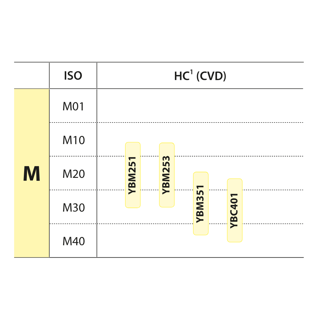 CVD coated M15–M35 carbide grade for medium to roughing operation in stainless steel with wide application field. High wear resistance and capability against plastic deformation at higher cutting speed.