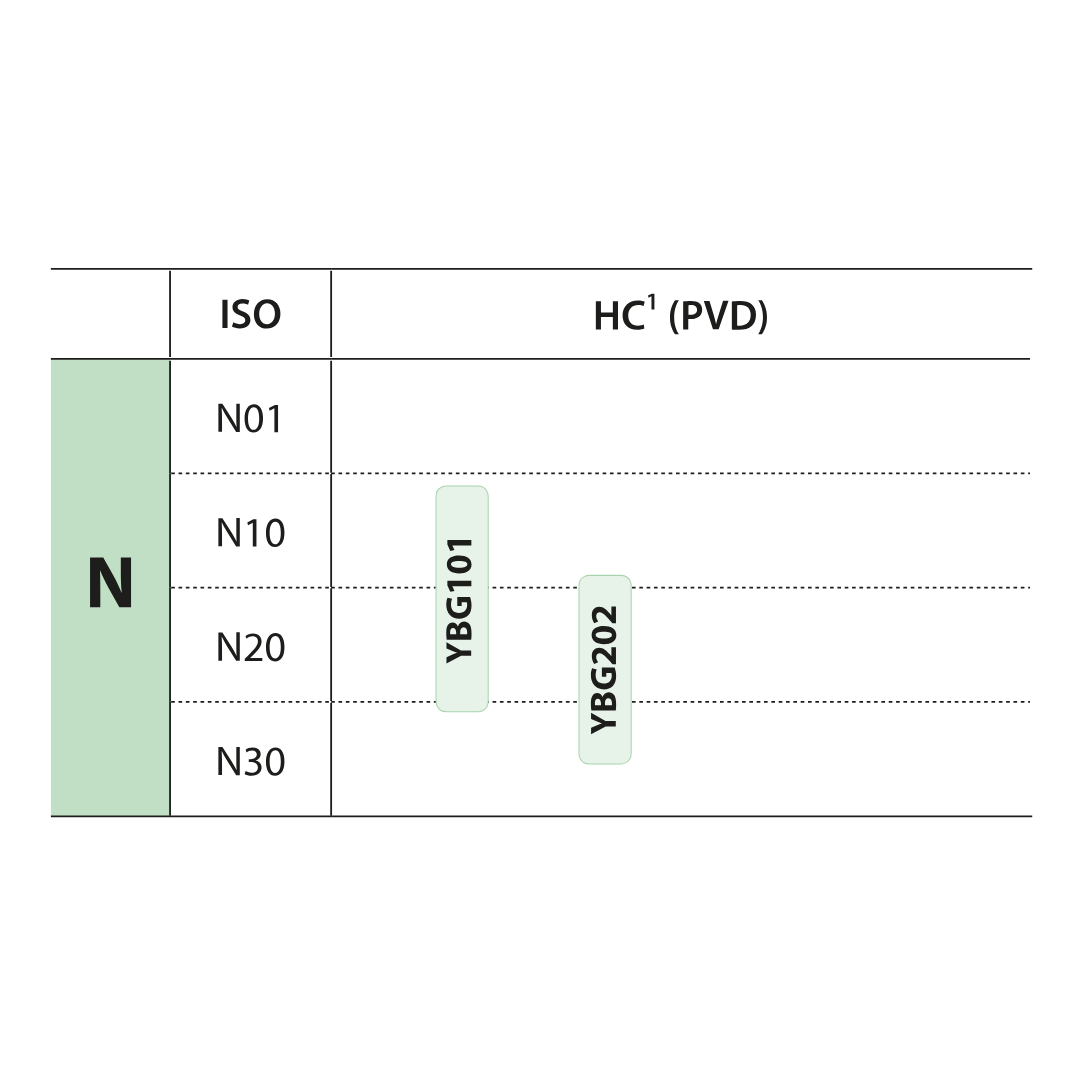 PVD coated N05–N20 carbide substrate for finishing to medium application in aluminium material. Coating only on the top face, in combination with the aluminium chip breaker, prevents build up edges and gives a smooth cut.