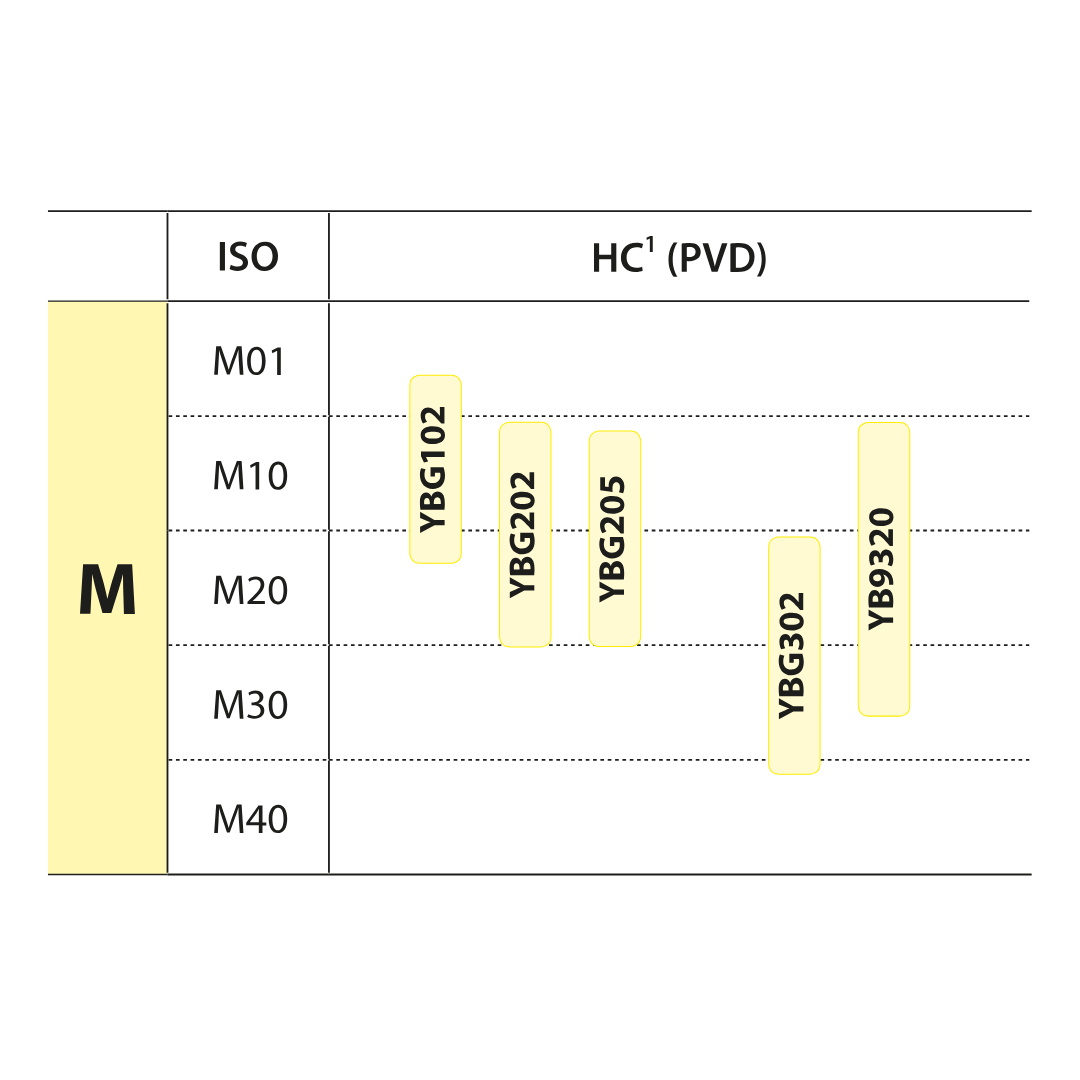 PVD multilayer coated M10–M25/P10–P30 carbide substrate for finishing to medium application of stainless steel, super alloy and steel (grooving/milling). Optimized coating stability for higher wear resistance and thermal stability in a wide application field.